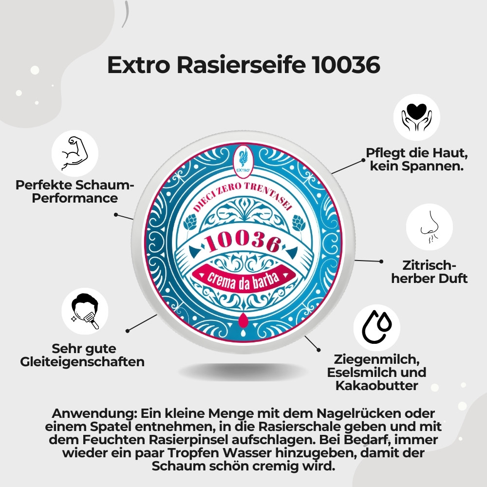 Die Rasiercreme 10036 wird häufig für alle Hauttypen gewählt, auch für die tägliche Nassrasur. Der cremige Schaum wird als gut ausbalanciert wahrgenommen und eignet sich sowohl für normale als auch empfindlichere Haut.